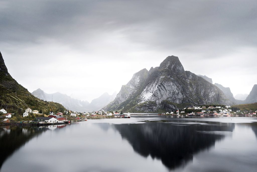 Pero las Lofoten son muy agradecidas y nada más llegar ofrecen al intrépido viajero su merecida recompensa: montañas que se alzan como paredes alcanzando alturas de 1.000 metros y cuyo reflejo tiñe de verde el agua, infinidad de lagos y fiordos, hermosas playas de arena blanca como la de Ramberg, pintorescos pueblecitos de colores anclados sobre pilotes, y lo más sorprendente, un clima suave con temperaturas medias en verano que rozan los 13 grados.